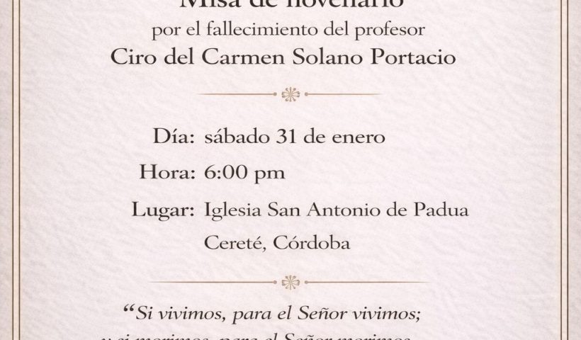 Ver más Hoy Sábado 31 de Enero 2026, es la tercera tarde de toros en corraleja en Cereté Córdoba, con la ganadería San Fermín de los hermanos AnayaHoy Sábado 31 de Enero 2026, familiares del profesor Ciro del Carmen Solano Portacio invitan a la misa de su novenario por su fallecimiento.
