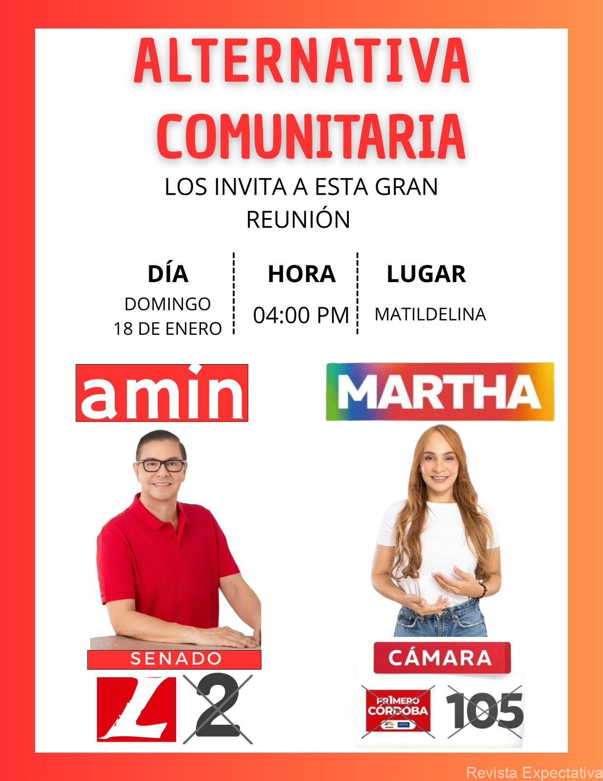 SAN PELAYO CORDOBA-. El directorio político de ALTERNATIVA COMUNITARIA desde ya invita al pueblo pelayero a una gran reunión en el sitio MATILDE LINA éste Domingo 18 de Enero 2026, a partir de las 4:00 PM, con la presencia de los candidatos al Senado de la República Fabio Amín y de la aspirante a la Cámara de Representantes de Martha Ruíz Solera, donde estarán expondiendo sus programas para bien del pueblo pelayero, cordobés y de Colombia.