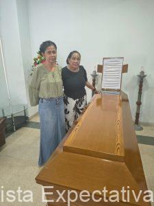Foto tomada en la sala de velación al ferétro donde yacen los despojos mortales de Olguita, acompañan sus hijas Diana y Zaida, por el colega Julito Quintana para Revista EXPECTATIVA..