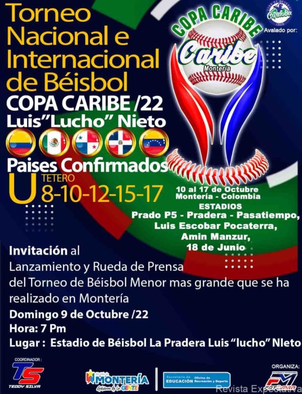 MONTERIA CORDOBA-. EN ESTA CIUDAD SE ESTARÁ REALIZANDO EL SEGUNDO TORNEO NACIONAL E INTERNACIONAL DE BÉISBOL … Copla «Luis «Lucho» Nieto, del 9 al 17 de Octubre con países confirmados, este evento se jugará en varias categorías desde Tetero en adelante, el cual se jugará en los estadios P5 – Pradera – Pasatiempo «Luis Escobar Pocaterra» Amín Manzur y en el 18 de Junio de esta ciudad.