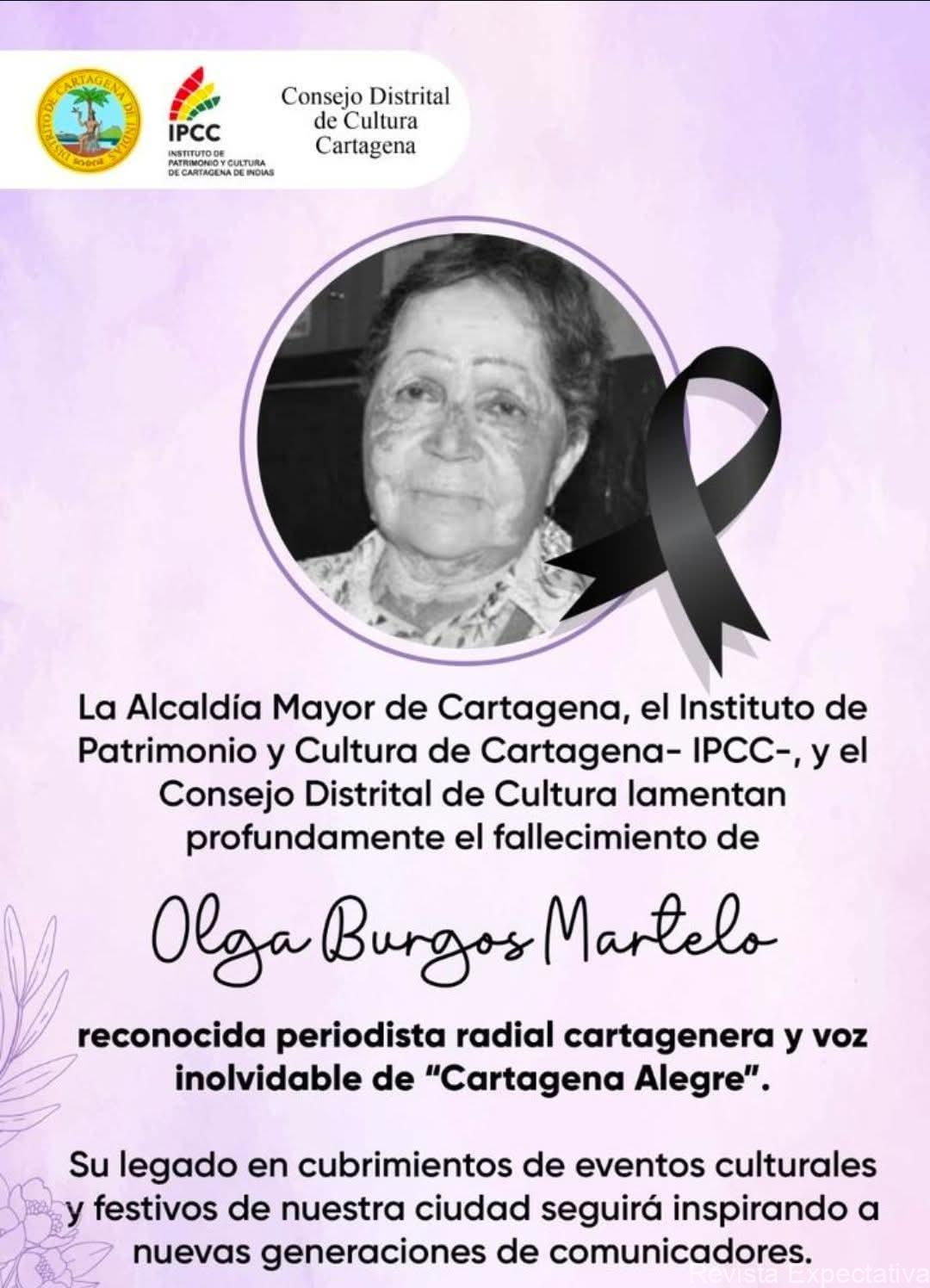 CARTAGENA BOLIVAR-. En el día de hoy Viernes 17 de Abril se desarrollan las honras fúnebres de la colega locutora y periodista Olguita Burgos Martelo, en esta ciudad, por su parte la alcaldía mayor de Cartagena, ha dado a conocer en nota de estílo su mensaje solidario de quien fuera en vida una de las mejores voces femeninas de la radio de Cartagena y del resto del Caribe colombiano, como se le recuerda fue una extraordinaria voz de la radio cartagenera luciendose en sus cubrimientos en los grandes eventos sociales, culturales y populares de Colombia, entre ellos el Rainado Naciopnal de la belleza, el Festival de la Leyenda Vallenata en Valledupar, el Reinado Nacional de la Ganadería en Montería, del Festival Nacional del Porro en San Pelayo Córdoba, el del Bullerengue en Puerto Escondido Córdoba y así muchos más, pertenció al Colegio Nacional de Periodismo y de la Asociación de Periodistas de Colombia, al lado de sus colegas de la época Vicente Robles Fernández, de Adelmo Jiménez «Yo Justo», entre otros ya fallecidos, hoy al lado de sus colegas Julito Quintana, Nataly López, Reneiero Simancas, Lucho Herrán y otros, la oficina la tenían debajo de la Gobernación de Bolívar, fue apreciada y querida en el gremio de la Comunicación o mejor de la Prensa hablada, escrita y televisiva, por tal importancia de ella la Alcaldía Mayor de Cartagena ha lamentado profundamente el fallecimiento de Olguita Burgos Martelo, en el siguiente mensaje en letra de estílo: ….lo que no hizo la alcaldía de Puerto Escondido Córdoba, de dónde ella era oriunda.