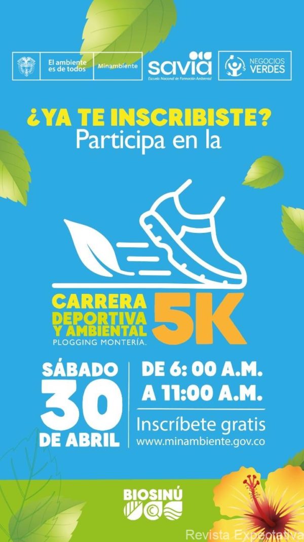 *Montería, 22 de abril de 2022 -MADS-.* El próximo sábado 30 de abril se llevará a cabo la Primera Carrera Deportiva y Ambiental Plogging Montería 5K. Se trata de un evento especial de cierre de la Feria de Educación Ambiental y Negocios Verdes BioSinú, que organiza el Ministerio de Ambiente y Desarrollo Sostenible.
