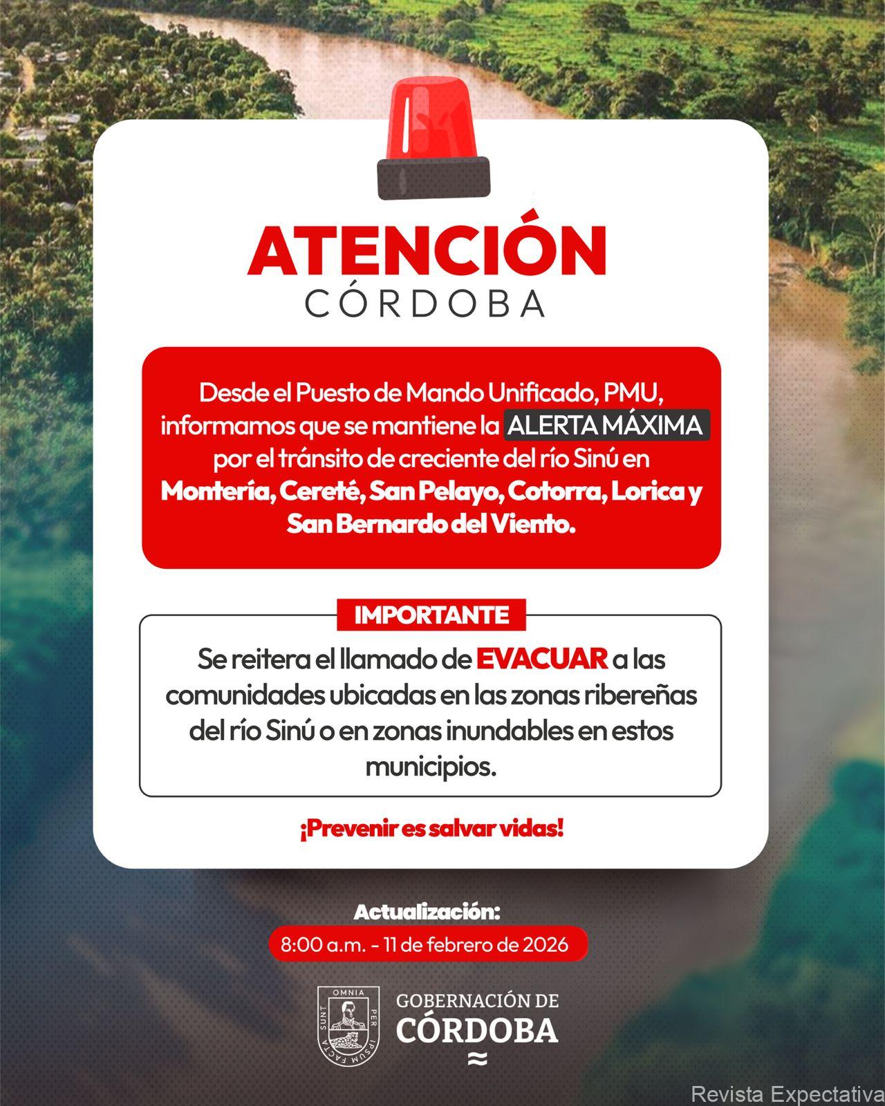 Montería, 10 de febrero de 2026. – Desde el Puesto de Mando Unificado (PMU), instalado para el seguimiento permanente de la situación climática en el departamento, se informa que Córdoba mantiene la alerta roja en las cuencas de los ríos Sinú, San Jorge y Canalete debido a las condiciones hidrológicas actuales.
