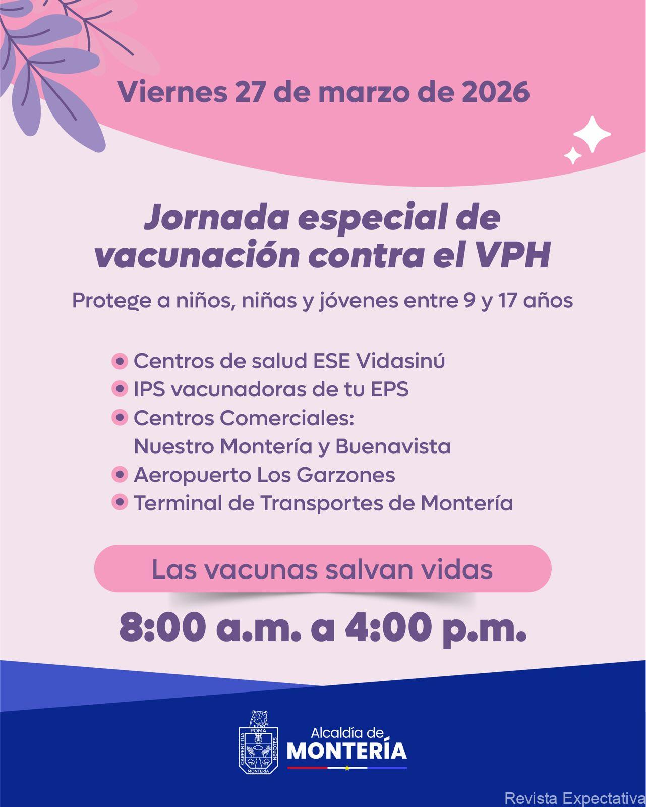 Montería, 26 de marzo de 2026. La Alcaldía de Montería, en coordinación con su Secretaría de Salud, programó para mañana viernes 27 de marzo una jornada de vacunación contra el VPH, una dosis que protege de los efectos del Virus del Papiloma Humano, uno de las causantes del cáncer del cuello uterino.