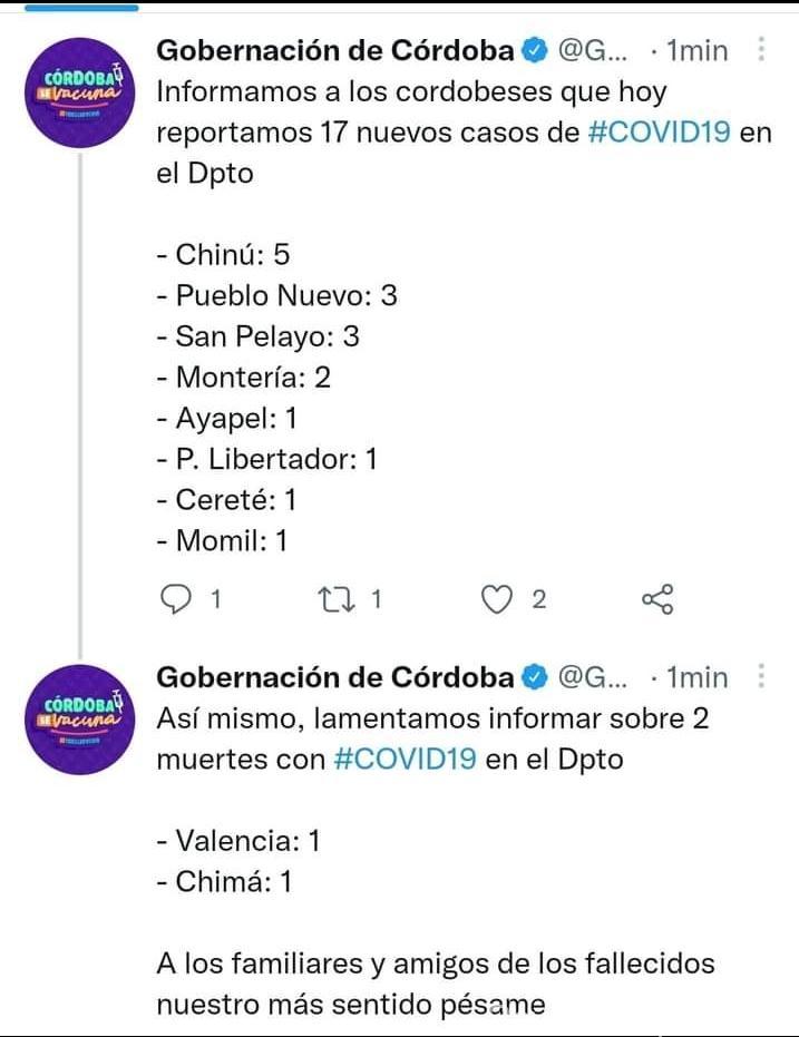 MONTERIA CORDOBA-. La Gobernación de Córdoba encabeza del gobernador Orlando Benítez Mora, vía Twitter, ha enviado el informe de la Situación Actual de la Covid-19 en Córdoba hoy Lunes 6 de Septiembre del 2021, a nuestros lectores de Revista EXPECTATIVA 40 Años, de la siguiente manera Contagiados 17 y 2 los fallecidos.