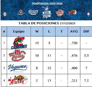 Tigres reaccionó en el momento preciso para doblegar 10 carreras por 9 a Vaqueros en el estadio “18 de Junio”, mientras Caimanes superó por blanqueada 15 por 0 a Toros en el “Edgar Rentería” de Barranquilla, en el tramo de juegos del sábado 27/12/2025.